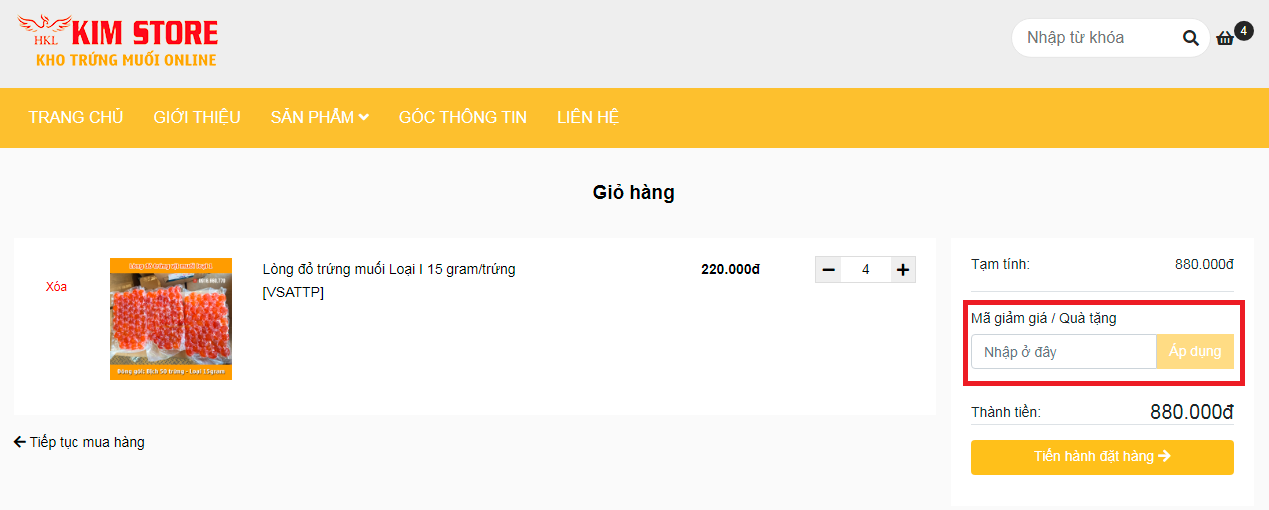 Nhập mã giảm giá (nếu có) -> Áp dụng, sau đó nhấn Tiến hành đặt hàng.