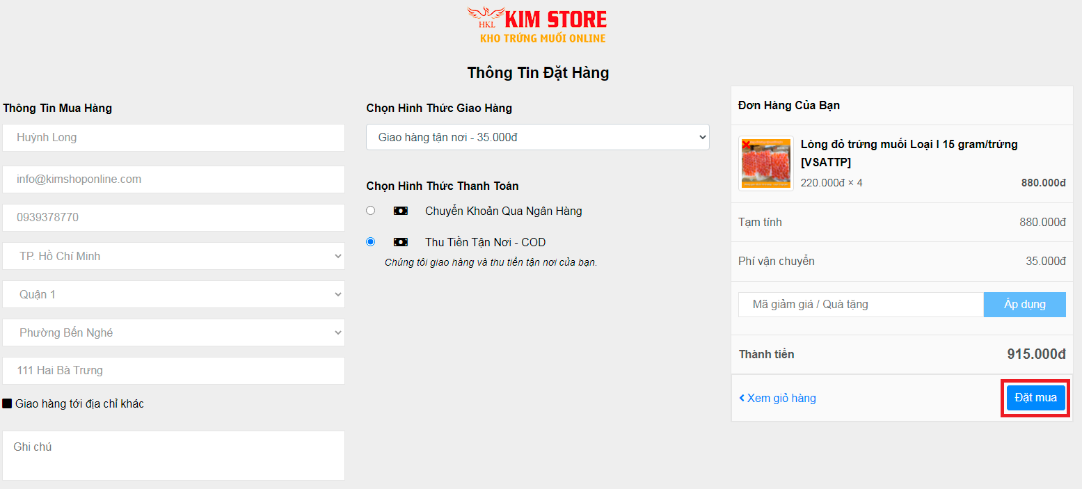- Khi khách hàng chọn hình thức chuyển khoản, bên Kim Store sẽ liên hệ đến khách hàng xác nhận đơn hàng và cung cấp thông tin chuyển khoản.